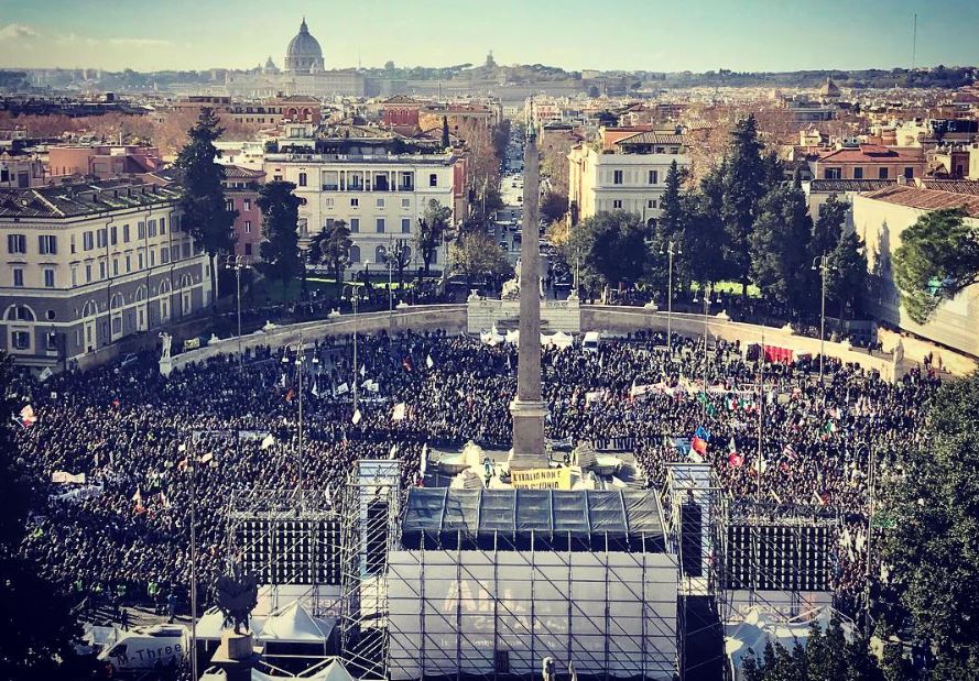 80mila persone in Piazza del Popolo a Roma per Matteo Salvini, secondo gli organizzatori della manifestazione della Lega. Il leader del Carroccio sale sul palco verso le 12.30, accompagnato dalle note dell’aria della Turandot di Puccini ‘Vincerò’, mentre dalla piazza si accendono fumogeni tricolori. Salvini ascolta la musica con la mano sul cuore.