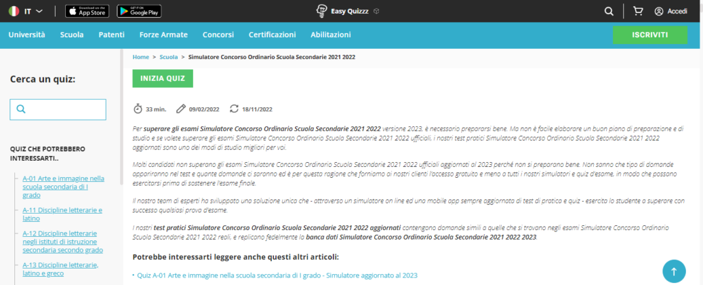 Le informazioni dettagliate che si possono avere leggendo le pagine che portano ai quiz sono preziose per chi vuole avere qualche notizia in più sul concorso che sta preparando, a partire dall’elenco delle materie su cui verte.