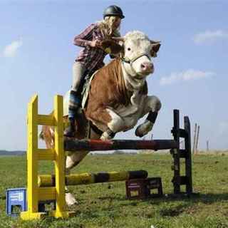Regina Mayer, 15 anni, con Luna, la mucca-cavallo, a Laufen, Germania. La ragazzina aveva il sogno di possedere un cavallo ma i suoi genitori non hanno potuto soddisfarla. Così invece di scappare nella sua stanza a piangere, si è affezionata a una mucca a tal punto da riuscire ad ammaestrarla come se fosse un cavallo. Ha speso molte ore insieme a lei e i risultati si vedono: cavalca la mucca, salta gli ostacoli e come premio gli dà qualche dolcetto e carezza.