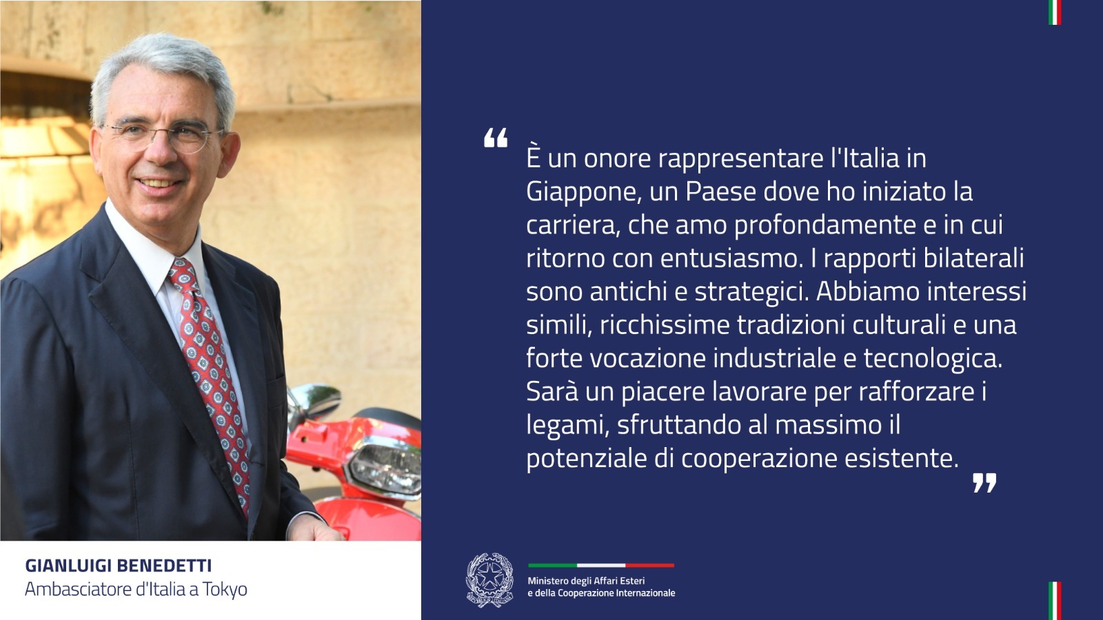 La Farnesina rende nota, a seguito del gradimento del Governo interessato, la nomina deliberata dal Consiglio dei Ministri di Gianluigi Benedetti come Ambasciatore d’Italia a Tokyo.