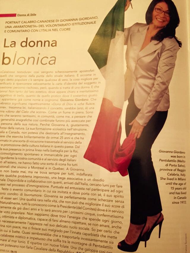 Giovanna Giordano, presidente del Comites di Montreal, calabrese di origine, vive in Canada dal 1972. La sua attività professionale e la sua missione di vita sono orientate principalmente a rendere agli italiani che lasciano la propria patria per il Canada, la nuova “casa” un po’ più comoda, un po’ più accogliente e un salto in un buio meno profondo.