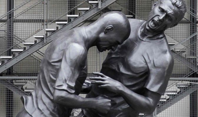 Ricordi, brandelli di memoria. Il pensiero che corre a ritroso, a una notte di felicità italiana. L’Italia del calcio in volo sopra il cielo di Berlino. La nazionale campione del mondo per la quarta volta, seconda solo al Brasile pentacampeon. Ricordate l’episodio, il momento chiave di quella notte di forti emozioni? Zinedine Zidane, stella di Francia, il condottiero dei blues, il sale e la fantasia della nazionale di Domenech, che perde il ben dell’intelletto. Mandato ai matti dall’astuta perfida provocazione di Materazzi, Zizou tira una clamorosa testata all’avversario italiano che lo martella con giudizi sulla presunta amoralità della sorella. La testata che decide, il colpo di testa che indirizza il destino finale dei campionati del mondo 2006. Zidane espulso, addio Francia; viva l’Italia. Quel momento, l’attimo della testata, la scena madre del mondiale di calcio: tutto quanto è una statua. Molto bella, un pugno nell’occhio, davvero una grande cosa. Alta quasi sei metri, realizzata in bronzo. Uno spettacolare monumento. “Coup de tete”, Colpo di testa, così l’ha chiamata il suo autore, Abdel Abdessemed, che ha inteso realizzarla come “un inno alla sconfitta”.