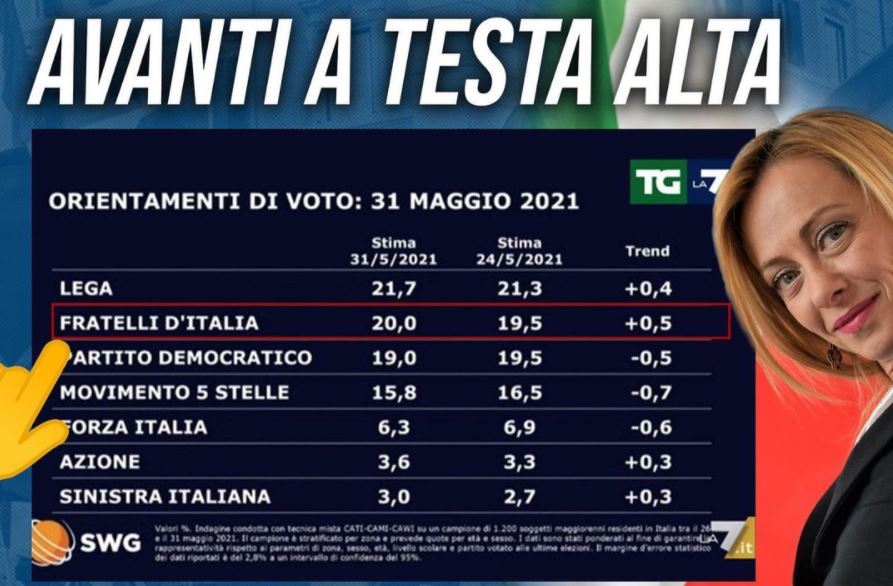 I dati salienti di questi ultimi giorni di sondaggi sono principalmente due: da un lato vi è una risalita del Pd che arriva al 19,3%, un livello sempre molto basso visto lo storico del partito di Letta, ma comunque l’aumento, di mezzo punto è degno di nota. Dall’altro Fratelli d’Italia tocca un nuovo record, il 19%. Per ora rimane al terzo posto, dietro il Pd, ma per quanto?