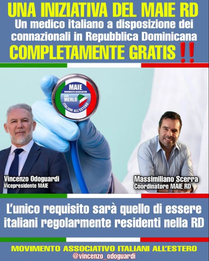 Un medico famigliare, internista, competente, gratuito e soprattutto italiano, per tutti gli italiani che vivono nella Repubblica Dominicana. Un sogno – si legge sul sito di Azzurro Caribe, periodico degli italiani di Centro America e Caraibi – che diventa realtà per i tanti pellegrini in perpetua lotta sanitaria. Grazie Massimiliano Scerra, grazie al MAIE RD e alla tua Commissione MAIE Salute e benessere: che tu sia benedetto tra tutti gli uomini, visto che il posto tra tutte le donne è già occupato. Una pensata che migliore, più solidale, più all’insegna della partecipazione e più promotrice di fiducia nella vita, proprio non si può.