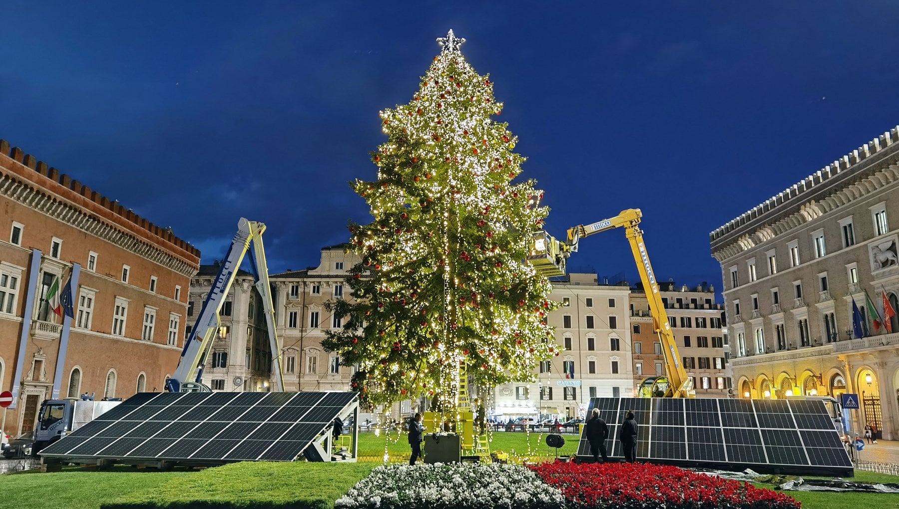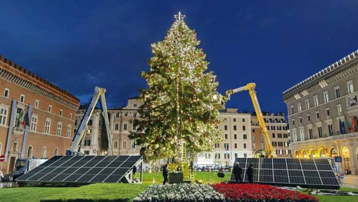 Pannellacchio o Pannellotto è l’albero che è stato installato a piazza Venezia e viene acceso con i pannelli fotovoltaici. Dall’8 dicembre l’abete dalle luci dorate svetta davanti alla rotatoria della piazza, ai piedi dell’Altare della Patria. Viene alimentato da due grandissimi pannelli solari che sono stati collocati nel centro di piazza Venezia e alimentano il sistema di illuminazione dell’abete.