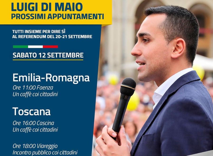 Tra gli appuntamenti principali si segnala la presenza nel pomeriggio in Toscana, a Cascina e a Viareggio, del ministro degli Esteri Luigi Di Maio, della vicepresidente del Senato Paola Taverna e del viceministro ai Trasporti Giancarlo Cancelleri.