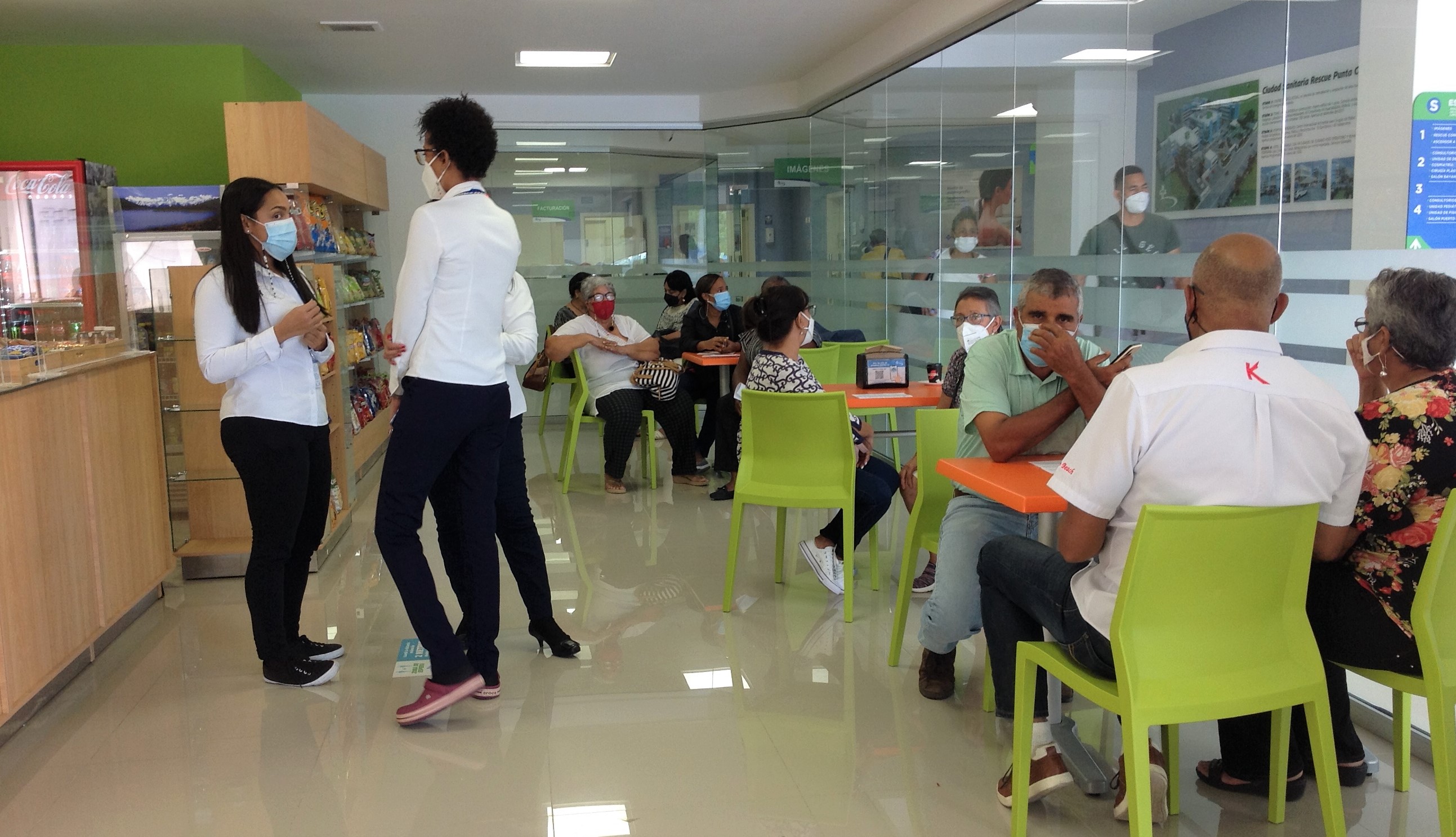 Sala d’aspetto improvvisata per ampliare la capienza, il bar della clinica, lindo e gradevole, con sedie distanziate. C’e’ una vecchietta filiforme di colore indio con doppia mascherina (di tela e di plexiglass). La morenita la guida premurosa verso una sedia ben distanziata. “Venga doñita (piccola signora) tome asiento”.