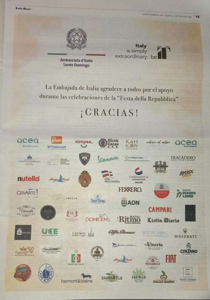 “Oggi leggendo il giornale dominicano Listín Diario ho trovato per caso questa pagina e mi sono ricordata di quanto ci siamo divertiti alla Festa della Repubblica organizzata dall’Ambasciata alla Fortaleza Ozama di Santo Domingo lo scorso 4 giugno, e mi son sorpresa notando il gran numero di aziende (italiane e non), che hanno patrocinato l’evento”. Lo scrive sui social Diana Spedicato, presidente del Comites di Santo Domingo, postando una foto del Listin Diario, il maggior quotidiano della Repubblica Dominicana, in cui sono presenti tutti i loghi delle imprese che hanno sostenuto la festa del 4 giugno organizzata dall’Ambasciata d’Italia.