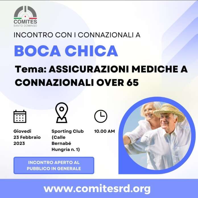 “Il Com.It.Es. (Comitato Italiani all’Estero) di Santo Domingo invita i connazionali che fossero interessati ad approfondire quanto recentemente ottenuto dalla Commissione “Salute, Medicina e Previdenza Sociale” del nostro organismo (accordo con agenzia assicurativa per poter stipulare polizze sanitarie in favore di cittadini italiani over 65 anni), ad assistere ad un incontro che si terrà giovedì 23 febbraio alle ore 10.00, presso la località di Boca Chica (ristorante Sporting Club)”. E’ quanto si legge in una nota del Comites di Santo Domingo.