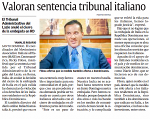 Ricky si è anche avvalso del suo movimento, il MAIE, il cui presidente, l’onorevole Riccardo Merlo, è venuto a Santo Domingo a proprie spese per incontrarsi con la nostra comunità e successivamente si è confrontato anche a Roma con il sottosegretario Amendola ed è stato il primo che ha confermato ai connazionali qui residenti che la Farnesina intendeva riaprire l’ambasciata di Santo Domingo. Comunque l’onorevole Merlo lo troviamo già all’inizio del 2014, cercando di proteggere i nostri interessi prima ancora dell’approvazione del decreto del CdM, contestando l’inclusione della nostra ambasciata tra le sedi da chiudere.