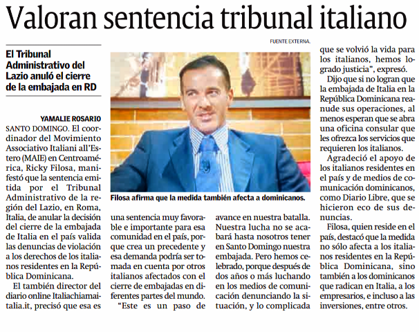 “La goccia scava la pietra”: all’insegna di questo motto Ricky Filosa ha condotto la sua battaglia a nome di tutta la comunità italiana di Santo Domingo per ottenere la riapertura dell’ambasciata. C’è voluta tutta la sua grande determinazione e grinta e c’è voluto anche il suo giornale ItaliaChiamaItalia senza il quale ogni sforzo sarebbe stato probabilmente vano.