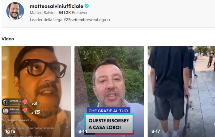 Una media di 100mila visualizzazioni durante le dirette di mezzanotte che sono ormai una consuetudine, circa 3mila follower guadagnati durante ogni singolo live, più di 10mila utenti connessi contemporaneamente, 450mila like, più di 300 dollari raccolti ‘in regalo’ e che andranno in beneficenza. Sono i numeri di Matteo Salvini su TikTok: il leader della Lega ha 540mila seguaci (primo in assoluto tra i politici).
